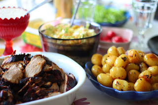rödvinsmarinerad fläskfilé och små chiliflakestekta potatisar och limesås.